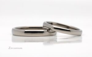 ジルコニウムは常温において強い耐食性があり、空気中では酸化被膜ができて安定した金属表面となります。チタンと同じく暖色系の色味を微かに感じることができます。比重は約6.5でチタンとステンレスの中間の重さでこちらも軽やかな着け心地となります。