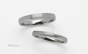 ハフニウムは常温、常圧において安定した結晶構造を持ち、タンタル同様、金属アレルギーでも安心して着用できる金属です。色味はタンタルとステンレスの中間に位置し、比重は13.31でK18ゴールドよりも少し軽く、硬度がプラチナの約3倍あり、常に身に付ける指輪の素材としてもお勧めです。